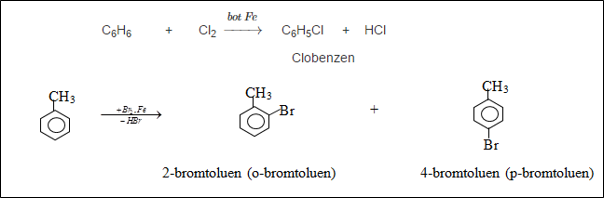 Ví dụ: như benzen hòa tan brom, lưu huỳnh, iot, cao su, chất béo trong khi đó toluen có thể hòa tan chất béo, dầu, nhựa thông, photpho, lưu huỳnh, iot. Về tính chất hóa học toluen là hợp chất thuộc dãy đồng đẳng của benzen nên cả hai đều có chung một số đặc điểm hóa học và có thể điều chế benzen ra toluen. Đăc trưng nhất là phản ứng thế ở vòng benzen với halogen . Để phản ứng này xảy ra phải dùng clo hoặc brom khan, xúc tác bột sắt. Điểm khác biệt là benzen cho phản ứng thế tại 1 vị trí bất kì, toluen dễ thế hơn benzen và cho phản ứng thế ở vị trí 2,4,6 (ortho và para).