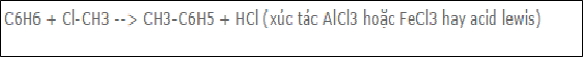 - Điều chế từ benzen ra toluen, do toluen là chất thuộc dãy đồng đẳng của benzen nên có thể dễ điều chế bằng cách cho benzen tác dụng với CH3Cl xúc tác AlCl3 hay acid lewis tạo ra toluen và axit HCl. Phương trình minh họa: