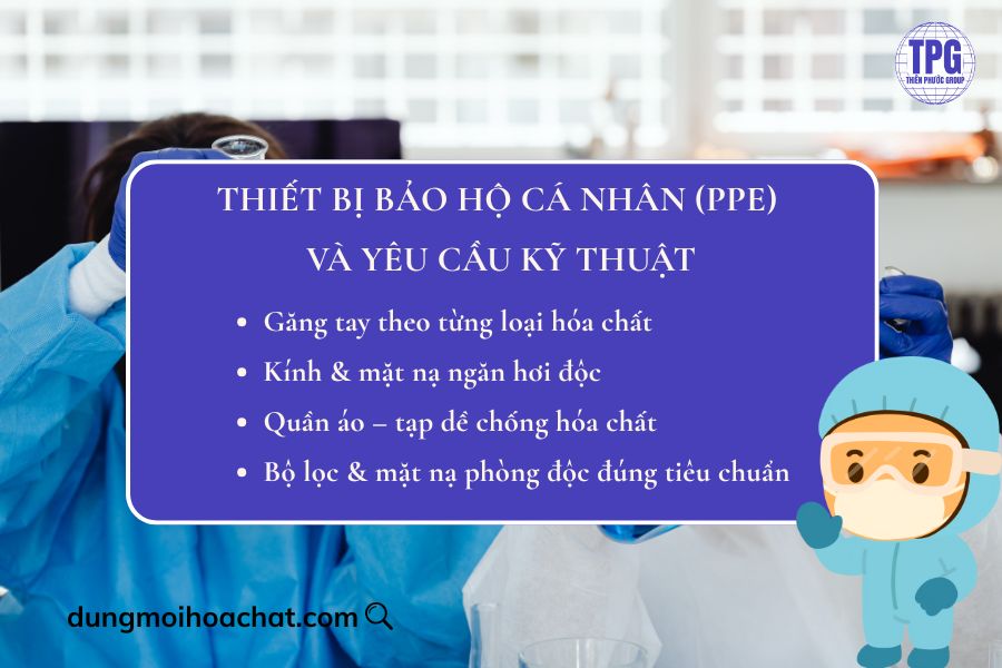 Trang phục bảo hộ đóng vai trò tạo lớp chắn giữa cơ thể và hóa chất, giúp giảm thiểu nguy cơ bỏng hóa học và nhiễm độc da.