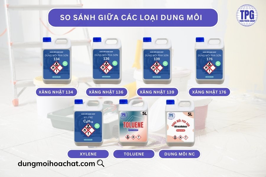 Dung môi pha sơn là yếu tố quan trọng quyết định độ bám dính, độ phủ và thời gian khô của sơn. Thiên Phước Group hiện cung cấp nhiều loại dung môi chuyên dụng chất lượng cao như xăng Nhật 134, 136, 139 và đặc biệt là xăng 176 dùng trong ngành sơn xe ô tô. Hãy cùng khám phá chi tiết đặc điểm và ứng dụng của từng loại dung môi pha sơn để chọn đúng loại phù hợp với nhu cầu thi công của bạn.