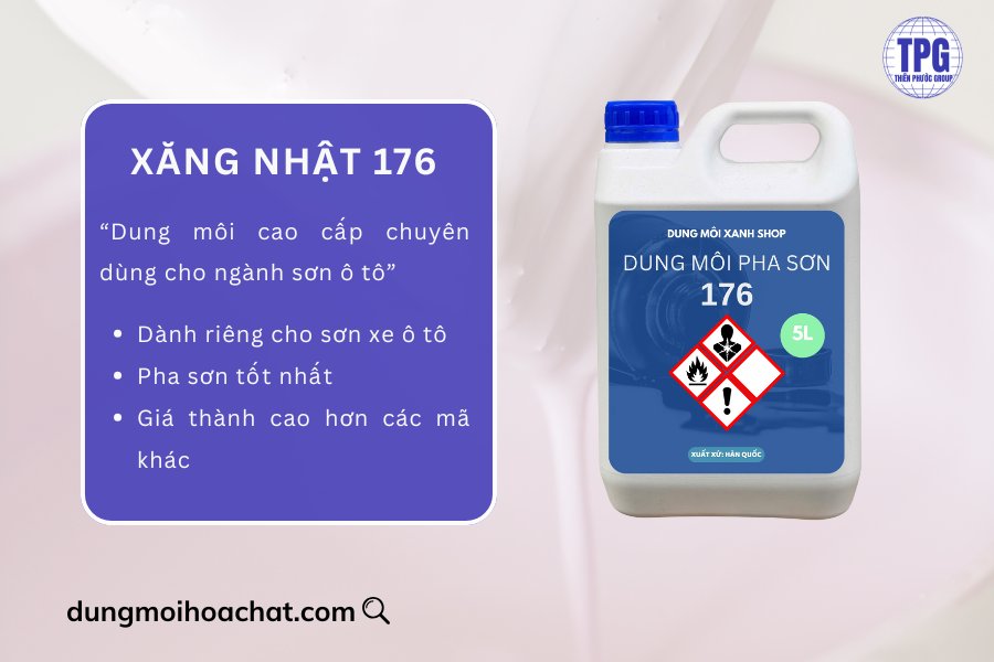 | Xăng Nhật 176 | Chậm | Cao cấp | Gara ô tô, sơn xe hơi, lớp phủ ngoài | Giữ lớp sơn tươi lâu, không đóng bụi, bóng sâu | Sơn phủ, clear coat ô tô, showroom cao cấp |