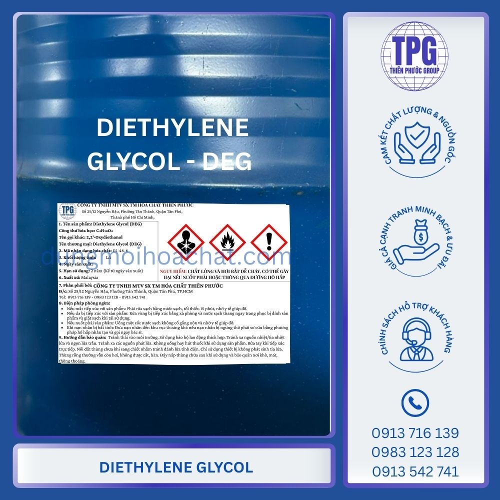 Diethylene Glycol (DEG) là dung môi công nghiệp quan trọng, được sử dụng rộng rãi trong sản xuất nhựa polyester, sơn, mực in, và nhiều lĩnh vực kỹ thuật khác. Bài viết này sẽ cung cấp thông tin chi tiết về cấu tạo, đặc tính, ứng dụng và cách bảo quản dung môi DEG, đồng thời giúp bạn hiểu rõ hơn về độ an toàn khi sử dụng và cách chọn nơi mua uy tín. Đặc biệt, Thiên Phước Group cam kết cung cấp DEG chính hãng, giá cạnh tranh, đầy đủ COA – MSDS, hỗ trợ giao hàng toàn quốc và tư vấn chuyên sâu. Hãy cùng khám phá đầy đủ thông tin trước khi quyết định mua dung môi DEG chất lượng cao cho sản xuất của bạn!