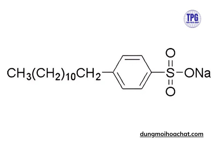 Công thức hóa học tổng quát của LAS là: C₆H₅–R–SO₃Na, trong đó R là chuỗi alkyl tuyến tính (từ C10 đến C14).
