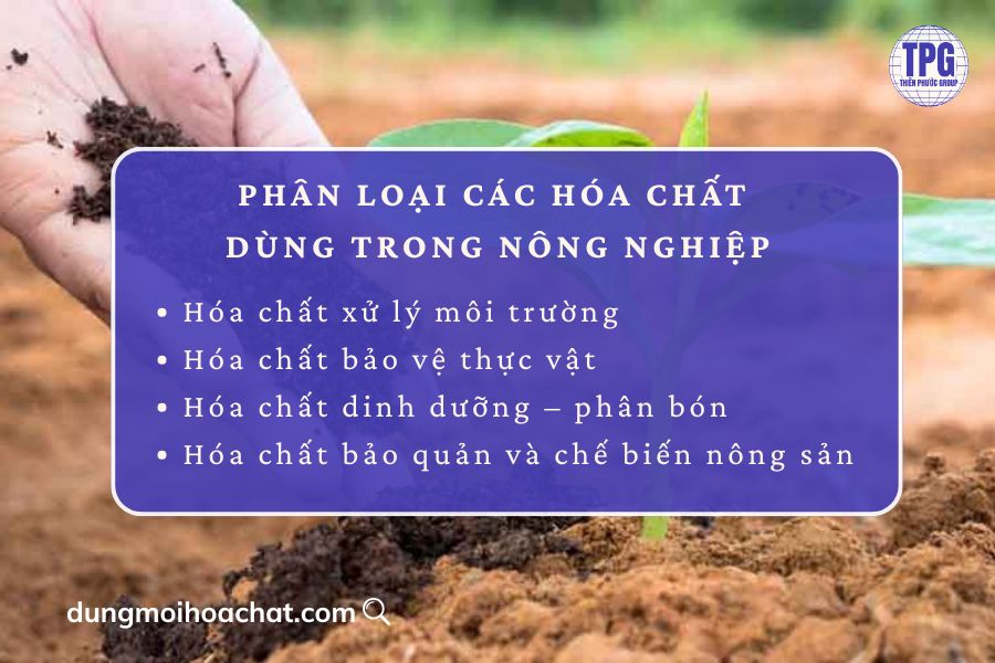 Trong lĩnh vực nông nghiệp, hóa chất được sử dụng với nhiều mục đích khác nhau, từ việc chăm sóc, bảo vệ cây trồng đến xử lý môi trường đất và nước. Dựa trên công dụng, có thể chia hóa chất nông nghiệp thành bốn nhóm chính, mỗi nhóm đóng vai trò quan trọng trong việc nâng cao năng suất và chất lượng nông sản.